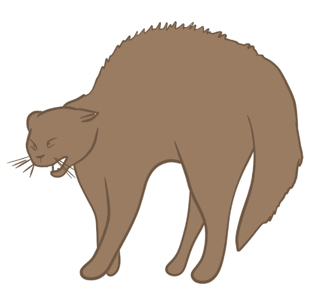 - chat irrité : oreilles généralement tournées sur le côté ou légèrement en arrière, sa queue fouette, il est en position latérale et sur ses appuis.