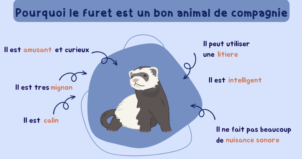 - intelligent : le furet a besoin d'être stimuler cognitivement, il peut apprendre à utiliser une litière, à répondre à son prénom,