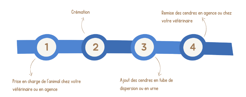 Quand vous êtes prêt, l'animal est amené à la crémation individuelle après laquelle vous pourrez réceptionner ses cendres dans un tube de dispersion ou dans une urne ou autre objet commémoratif.