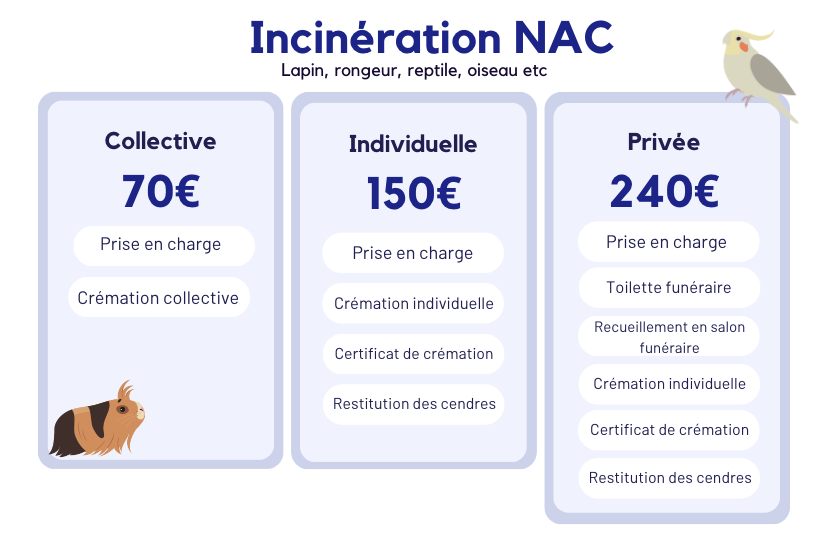 - privée : pour chiens, chats et nac seulement, crémation individuelle avec recueillement en salon funéraire.