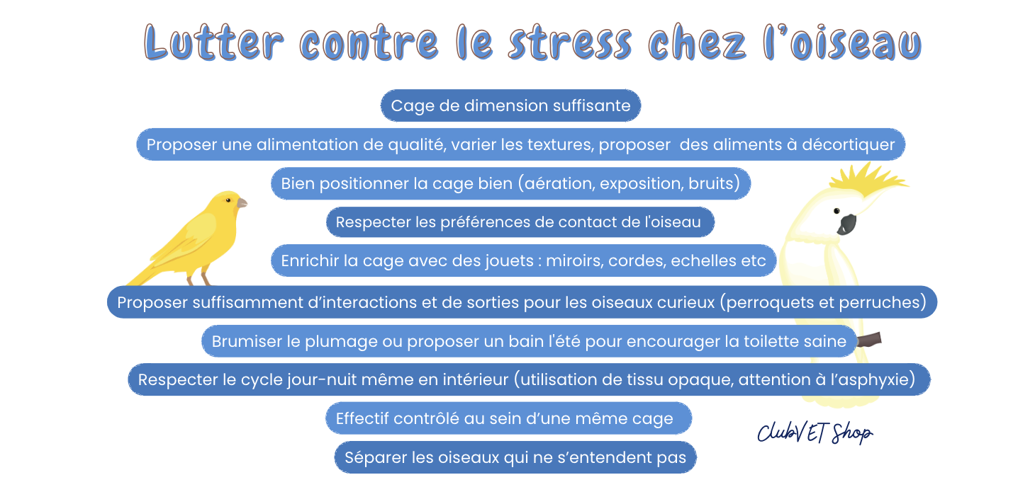 - stress social : oiseau isolé ou en trop gros effectif,