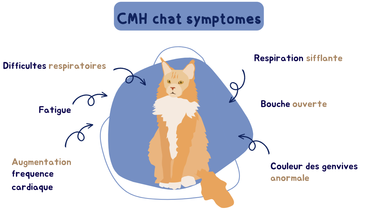 Tous les chats porteurs de la CMH ne montrent pas de symptômes, ils peuvent arriver de manière fulgurante ou progressive, dans tous les cas, si vous observez ces symptômes consultez rapidement votre vétérinaire.